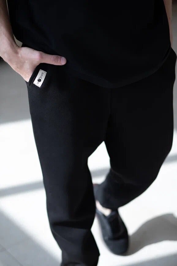 • Джоггеры из футера компакт пенье • Для него/для нее • Утепленные • С карманами • Пояс и низ на резинке • Логотип из кожи