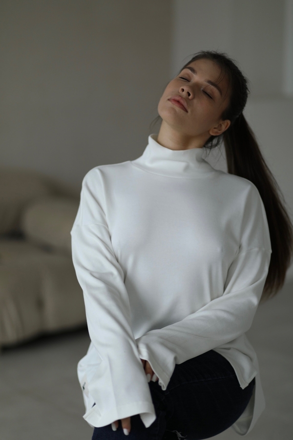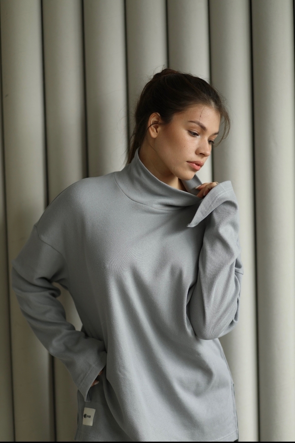 • Бадлон из плотного хлопка • Воротник стойка • Свободный прямой крой • Удлиненный низ и рукава • Спереди логотип из хлопка